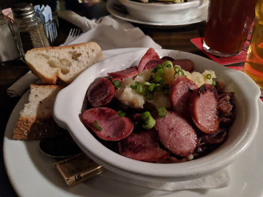 Have dined here twice in the past 6 months. The last time back in October, the beer, food and service were great (got the beer cheese crock and mussels). I went back there 2 nights ago and it was a different story. We were greeted by a snarky guy who tried to seat us (a party of 2, on a fairly slow Monday night) at 2 tables between loud parties. When we asked if we could sit at a 2 top ,adjacent but not between, he said "fine" and heaved a sigh. Our server was nice and mindful of our needs but deinitely steered me wrong on the food. When I asked between a burger and the shepherds pie, she said the pie. It was terrible! It was like canned vegetable soup (raw sliced tomato in center), mashed potatoes floating on top with, a (and I am not kidding) a Kraft single melted on top...price:$11.50. It was disgusting to say the least. Anyways, I might return for a good pint or 2 but will never go there for "dinner" again.