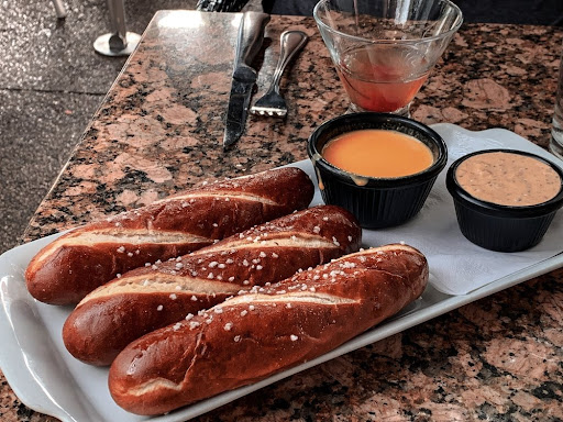 Food is alright. Their burgers are subpar, certainly not the best in the area. Each time Ive been here my fries have always been cold and dry, probably batch fried and kept under a heat lamp. A restaurant which wont even cook fries to order should not be charging $15 and up for a meal. Today I watched the bartender carelessly handle dirty glassware and pour beer without washing his hands. I saw a food runner snatch an onion ring off a plate before taking it out to her table. And last but not least, I had to ask the hostess to stop sweeping around my table as I ate. I called it quits when I could see the dust settle over my food - enough was enough. This restaurant is disgusting. Save your money and eat elsewhere.