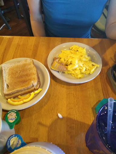 Service very SLOW. Sat for 10 minutes before being greeted by our waitress. Food was quick and great prices. Bacon was petrified, eggs were ice cold but cooked perfect, hash browns were cooked but mushy. Didnt need anything but sat for another 10 minutes after we ate and stacked the plates on edge of table for her. Finally went up front to pay but didnt have ticket. Host called the waitress over to retrieve our ticket. What was she doing? Reading the paper....oh yeah the ice breaker was when we found a snake skin underneath our table. GROSS!! NOT!!