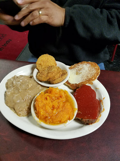Toe curling, lip smacking, slap somebody (just not the police officer thats there) good food! I came on a cold and rainy January night after work. Tired and hungry a native Indy friend of mine recommend this place for me to stop by. This was the PERFECT choice. I came near closing but was allowed to sit down and eat. I got the choose two meats and selected the smothered pork chop and meatloaf with greens, fried green tomatoes and fried cornbread with a side of Mac and cheese. This is the meaning of comfort! I had to catch my feet from dancing under the table and my shoulders from doing the shimmy! I am from South Carolina and used to southern food and this just made me feel like I was at home. Look forward to my next trip to Indy to come back here!