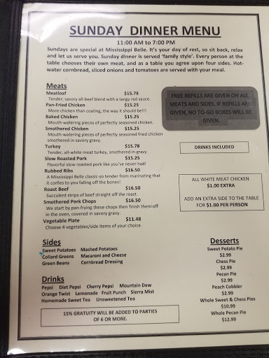 HORRIBLE. Family of 7 went to Mississippi Belles on Sunday, Marc 8 2015. We arrived and were seated almost immediately The only thing HOT were the Yams. The Dressing was not flavored and cold; Fried Chicken, Hot Water Corn Bread was cold and we only had a SPOT of gravy with the dressing. I ordered Smothered Chicken it was cold and not very well seasoned. The Mac & Cheese was soupy and cold. Bland. they have either changed cooks or the way of doing things. Our waitress NEVER offered us refills on anythng but drinks. We were planning to visit on Easter Sunday. Dont if we want to take a chance. For the amount of money spent I and the guest were not please. Even my grandchildren, ages 4 and 7 complained.