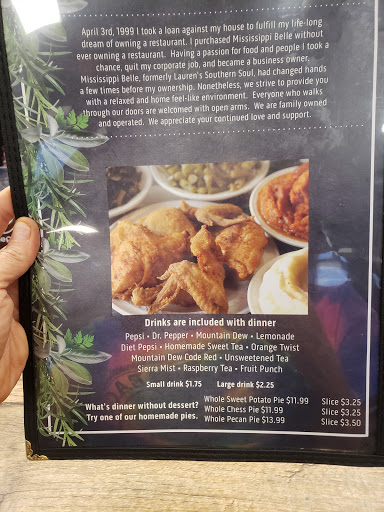 Why have I not tried Mississippi Belle before? Miss Dee provided fast, warm and friendly service. We had the fried pork chops and pan-fried chicken, which were tender, juicy, and PERFECTLY seasoned. The mac-n-cheese was to-die-for! You will not leave hungry or dissatisfied. I highly recommend Mississippi Belle!