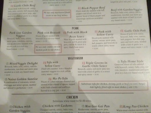 So sad when they temporarily closed - most dishes are quite good. I do believe they serve vegan options as well. The soup and crab rangoon are amazing. I have had a couple of chicken dishes and was not disappointed. The only complaint is the staff - awkward, slow, not attentive- like every time - but it has been a bit since I have been back.