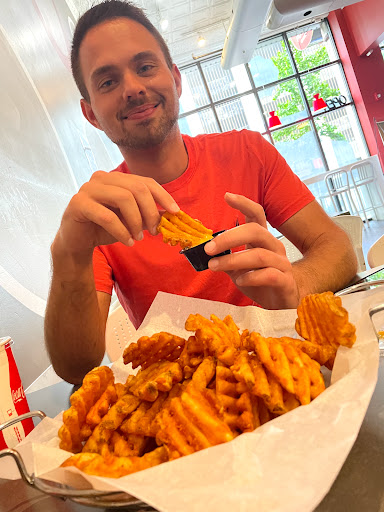 Great spot for a quick lunch! Burgers, fries and shakes (plus new chicken sandwiches). Got in at 11:45am and beat the rush. Service was fast and friendly. I was able to find a seat quickly and wait for my number to arrive. By the end of my meal (12:10) the place was PACKED but food still flowed out and tables turned over quickly. Loved the fact that my shake came out when ready, NOT waiting on the burger too. Got the Burnt Cheese: a nice crispy burger, homemade pickles, onion, tomato, lettuce, special sauce; then 3 pieces of cheddar cheese BURNT. The sweet potato tater tots were off the hook. Try the Nutella Shake, much better than just a Chocolate Shake. Give the Burger of the week a look, lots of great option over the course of the year PLUS you can always build your own with tons of options on the chalkboard!