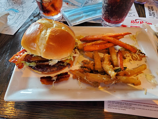 Good location and friendly staff, popular items all over the menu - I really love the Blue Ribbon burger and Salted Caramel Monster Shake. Prime Chophouse, Bonzai, and Whiskey River BBQ burgers also make great choices and sure to fill with bottomless steak fries. The bar has some good drinks but like most chain restaurants its hard to recommend the overpriced cocktails. However the spiked milkshakes are a treat one could justify. The Red Robin Royalty rewards program makes for fun discounts and a free birthday burger. One of the solid American restaurant chains that does a lot better than most of the others.