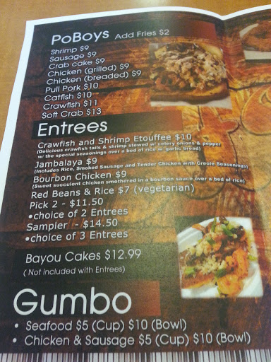 Just ate there with my family. I was born and raised in southwest Louisiana so I know what these dishes are supposed to taste like and everything was great. My daughter had the seafood gumbo, I had the bayou cakes (grit cakes with shrimp), my boyfriend had the etouffe, and my son whos only four ate gator bites and macaroni bites. The service was great and the owner was very friendly. He even brought out some sample of dishes for us to try. The atmosphere is very nice too. Being a Louisiana native I am very critical of anywhere that claims to serve Cajun food and I can say that this place has gotten it right! We will be regulars here from now on.