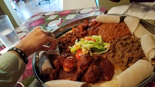 I can not express how much I love this place. The food is amazing, the owners and employees love to talk their customers, and it is such a lovely atmosphere. The owners are super nice and genuinely want to know how you are doing. On the left side of the restaurant there is a bar and on the right side is a coffee bar. They have some booths as well as one large table for large parties. The whole restaurant has authentic textiles, art work, and effigies from Ethiopia. I truly recommend this place for the adventurous eater and for someone who wants to embrace and learn about a new culture.