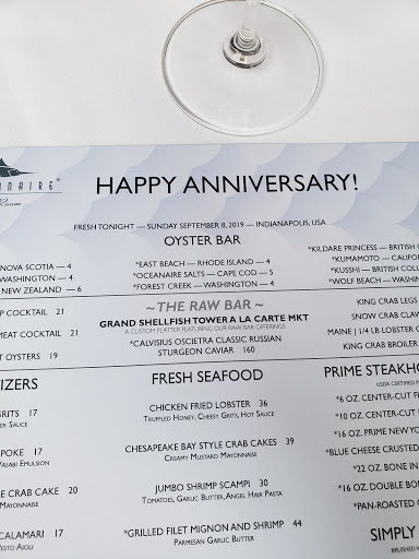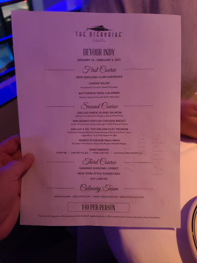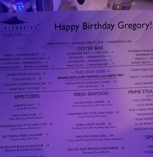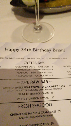 We have been to the Indianapolis Oceanaire several times, but also to Oceanaires around the country. My family and I are seafood lovers. The food and drinks were delicious as usual but the service was absolutely terrible. Our waiter was a jerk. Two guests at our table ordered lobsters. We were told that the smallest lobster they carried that night was a 2lber. When the two lobsters arrived one was over two pounds and one was much smaller (about 1.25lbs). When we brought this to the attention of the waiter he was extremely rude and said that we were wrong, got his manager to bring another lobster to compare after we told him not to. Also, he was quite fresh with the youngest woman at the table. To top it off, he asked my mother "Are you trying to get drunk?" after she poured herself the last bit of wine from the bottle shared among five people. We expected a much higher level of professionalism from a waiter at such an expensive restaurant. You can get an equally delicious seafood dish at Mortons or Capitol Grille. Needless to say we will not be back.