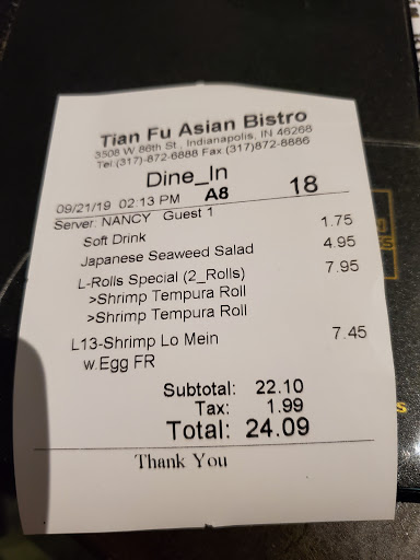 Edited(4*): Ordered online and arrived 30 min after order was placed. The receipt I was to sign was scribbled all over (like when someone tries to get ink from a pen flowing) and the food was not ready. I was hastily ushered as a walk-in and it took about 20 min for the food to be prepared. The crab rangoon wasnt as crispy as it should have been, and the General Tsos Chicken wasnt as flavorful as Im used to having. Not bad, still, but seems like the timing and quality is going down a bit. Prior(5*):Tremendously wonderful food. Their sushi isnt the best in Indy, but its tastey and nice to have alongside their other food. The atmosphere is very down-tempo with the lighting, but watching the chefs prepare the food in the kitchen (Glass you can see through into restaurant) makes things have a little tingle of a rush. I have always had good service there, but mostly I order online for pickup. May I recommend the Crab Rangoon with General Tsos Chicken? $$$/5 It can get a little pricey because of the amount of food ordered, but its pretty fairly priced.