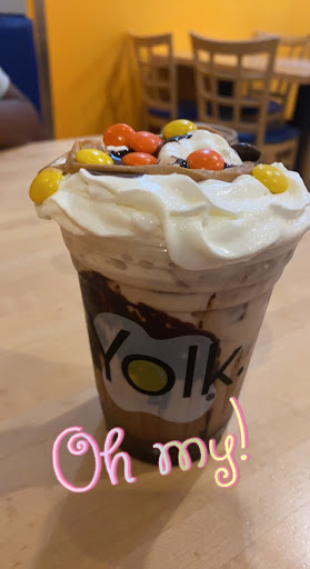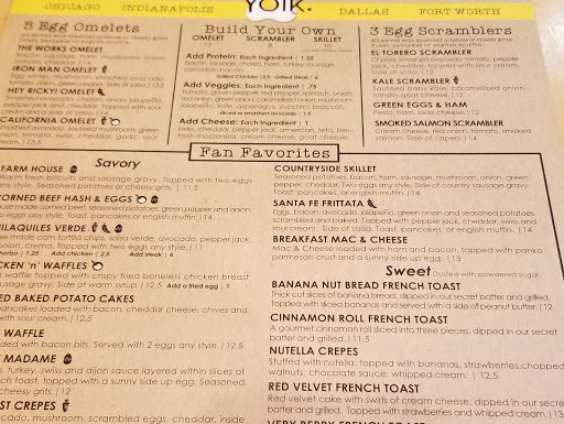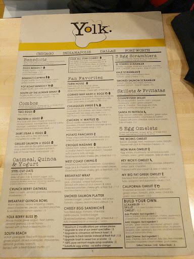Im a sucker for all things brunch- And Yolk meets all of the necessary criteria for a satisfied stomach: -A Strong Menu- Whether my taste buds are craving sweet or salty, the menu has a plethora from steak skillets to omelettes to red velvet french toast. -Heaping Portions- Breakfast is the most important meal of the day, so you either have enough food left on the plate that you know you cant fit another bite, or you power through the deliciousness. -Yummy Food- Ive had drop dead amazing chicken and waffles to average nutty monkey pancakes, but nothing that didnt deserve to be devoured, though they could work on their bacon crispiness. (fyi- try the strawberry orange juice) -Friendly Service- The wait time has finely hit just a few minutes on busy Saturday mornings! They are over that new restaurant rush but still remain packed to the prim. They even accommodate large parties well. For a group of 10 they initially told us 40 minutes but had us seated in 15! The only draw back is that parking can be a pain and the prices are a little higher than they could be. Its purely the great spread of menu options that puts Yolk above other Indy Brunch sites in my book!