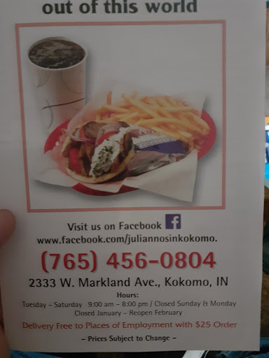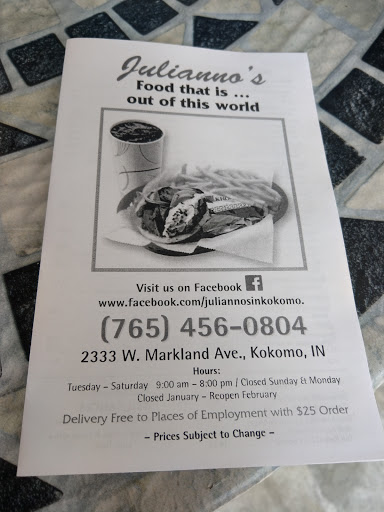 Juliannos is a takeout restaurant with great homemade food. They are closed from late December until early February because they do not have a heated dining room and restrooms. They certainly do not deserve the 1 star rating given by Boothby because they werent open during that time to cater to him. They have delicious smoked pulled pork and ribs, great dogs and gyros. I take friends there to eat outside when the weather is nice, and take home for myself often. Try it!