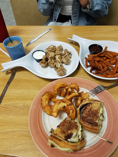 Food was good, and wait staff was friendly. Id eat here again. I had the poutine skillet, and it was pretty good. I hear the chicken and waffles are great. I wouldnt get the poutine again. It wasnt bad, but it wasnt what I was expecting. My daughter had pancakes, eggs, and bacon, which was very good.