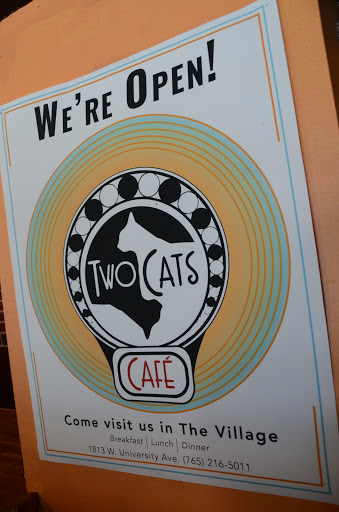 Two Cats has the most friendly, attentive staff Ive encountered in Muncie. There are options for omnivores, vegetarians, and vegans. This is a great place to come if you have friends who follow different diets. The food is delicious, the smoothies are to die for, and the environment is welcoming and comfortable.