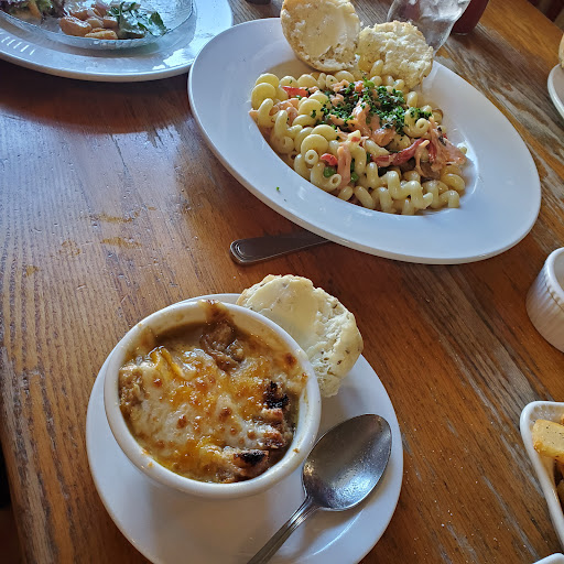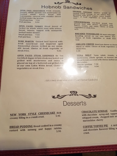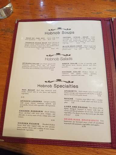The Hobnob is a great, local restaurant that serves a nice mix of food. Portions are very large and will fill you up. Theyre well known for their Hobnob Onion Soup and I always have a bowl when Im in town. Ive been going to the Hobnob since I was a little kid and although the menu hasnt changed much since then, it is still one of my favorite places to eat in Brown County.