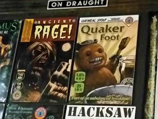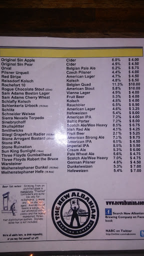 I have never eaten here, but come here just for the beer. All the draft beer can be taken home for $8.50 if you bring in your own growler (64oz). Im a 22 year old head and dont have the money for the food, but Id take a friend out here to have a good converstaion. A teacher took us here during my high school days and met the owner, Roger. Anytime you come in there is new beer and it seems he is "searching for the sound" in terms of beer. The dead my be touring, but Ive found family in the New Albanian. How about a $5 growler refill day like BBC does? 8.50 is too much too keep a bunch of beer at home, but one or two is pretty sweet. The food looks good, Id love to eat here.