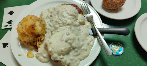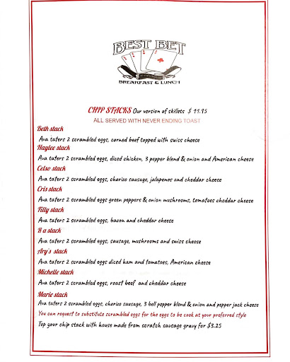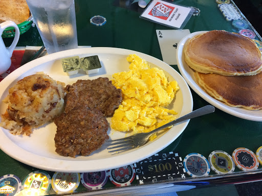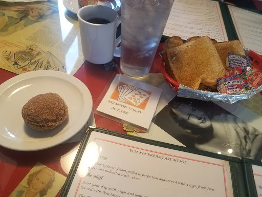 First and last visit! “Unlimited” toast offer brought immediately to the table with menus is gimmicky. I like my toast served warm, with my meal and I’d like a choice of breads. Toast shouldn’t be treated like chips & salsa, it’s not the same thing! Didn’t appreciate the deliberate omission of the traditional two egg breakfast, you either get one or three. I had to order the three egg breakfast and request only two eggs. Predictably, there was no adjustment to the $7.25 price tag. Very skinny strips of bacon lacked flavor, was cooked well in advance and served room temperature. My husband’s omelet was the worst he’d ever had. The sausage lacked flavor and was stuffed with an overwhelming amount of mushrooms that weren’t even fresh but were of the canned variety. We didn’t like their so-called signature potatoes. Was more like a mound of mashed potatoes with chunks of onion. Like another reviewer, not sure a poker theme is right for breakfast atmosphere. Staff was generally friendly but I’m a bit disturbed by someone with bright green hair serving food. Was also a bit odd that when our waiter introduced himself and then asked us our first names as well. Are formal introductions in this setting really necessary? Don’t waste your money! Overpriced, for bland, tasteless cold food!