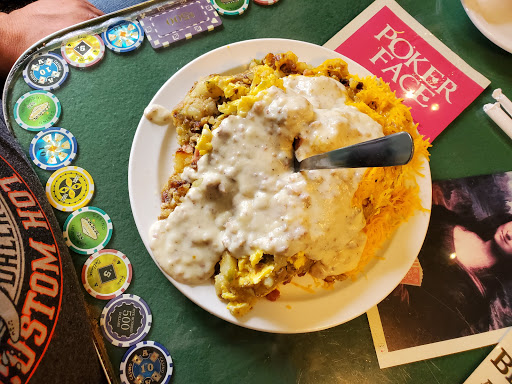 Ive only been here once and it was a good experience but I can definitely understand that its not for everyone. Its a very small place with limited seating and no where to stand while waiting for a seat which can make things very crowded on the weekends. Very heavy poker theme as well but I like playing cards so I enjoyed it. I dont understand why some complain about the free toast but I really liked it. Someone complained they like warm toast with their meal... then ask for some more when you get your meal... DONT LET IT JUST SIT THERE... ITS FREE AND ALL YOU CAN EAT!!! Shouldnt be too hard to comprehend. Anyways the food was slightly above average but nothing that great but I dont like much breakfast food besides pancakes. Tried their biscuits and gravy which I was told was excellent and I like my own gravy better. The one thing I didnt like is how expensive it was. Normally, a breakfast place that charges a lot makes up for it with extremely large portions. This place gets the portions right (even though they make things a la carte) as far as how much a person can reasonably eat but still charges the high prices. It cost my wife and I $25 with tip to eat. Thats just too much IMO for breakfast. Overall, Id recommend checking it out once but not a place to go to frequently. Side note: I can see why some dont like the owner. He is an old stubborn guy.