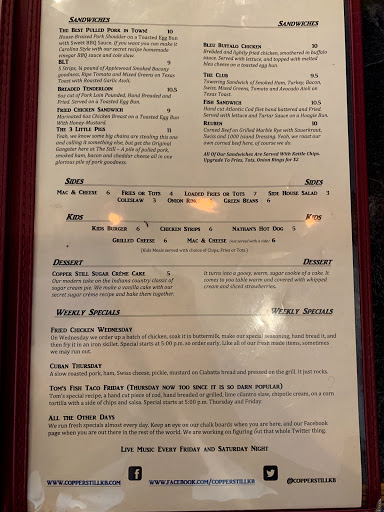 My husband and I traveled 20 miles Away from other reputable establishments to Copper Still. We were greeted immediately and seated at the bar, because of the wait being longer than 20 minutes. We were seated, a young lady came to our bar table, she took our drink order and later returned with our Ice tea and lemon water. We had to stop her from wisking away again to place our order for our "Tenderloin Trail" sandwiches. Thats when it felt like a B.O.M.B was dropped on my feelings "oh were sold out of those" ... my husband asked the young lady is there another tenderloin joint in this area? She was dumbfounded, she proceeded to pull our drinks back. She asked did we want to order anything else, I told her No we were in search of a delicious loin. She took our drinks, I do not recall an apology but if she offered one it was not recognizable. She did not offer to put our drinks in a to go cup, she took them away. If the food is as good as Ive read the service is as bad if not worse based on my experience today. Not prepared for the Tenderloin trail 2017.