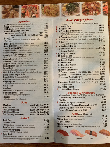 Definitely our favorite restaurant! We always get the sushi. Each roll is made to order and absolutely delicious! I also very much enjoy their tea. We usually get: California Roll Mango Tango Kobayashi Dragon Caribbean Caterpillar Tropical This is family owned and operated by two of the nicest people you could meet. They have managed to find the friendliest - and most patient - waitresses as well. Kobayashi is always a fun family dinner for us and we try to go there as often as we can. If youre like us and enjoy sushi and have a larger family, they do take orders in advance to reduce your wait time once youre seated. See you there! あなたの夕食を楽しむ (enjoy your dinner)