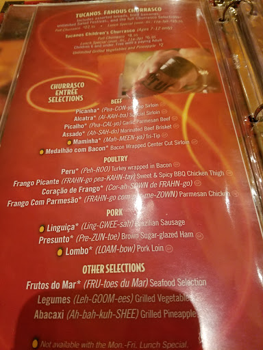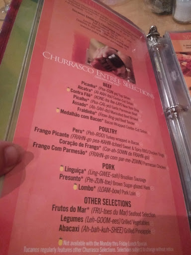 Many of the negative reviews previously posted include comments that the meats are too salty/incredible, that service is weak, and that they push the pineapple and vegetables hoping youll eat less meat. This was not my experience today. If anyone would be shorted good service, I suspect it would be the single guy visiting for lunch around 2:30pm. I elected to sit at the bar where I received great service from Sarah. The churrasco offers a delicious and diverse meat selection largely cooked to order delivered by attentive and courteous servers at a good tempo. The salad bar was extensive and I sampled many good items. The drink selections are numerous. The meat servers and Sarah were all interested to know which meats were my favorites so they could bring me more of what I enjoyed best. If I had left hungry I would have only myself to blame. As one who has enjoyed a fine meal at Fogo de Chão downtown, I was curious how this meal would compare. Fogo was certainly better though it is not a fair comparison as I dined at Fogo for dinner, not lunch, and, like Fogo, Tucanos offers a larger meat selection for dinner. While the overall quality at Fogo was better in my admittedly uneven comparison, the price at Tucanos truly makes it a bargain. I look forward to my next visit.