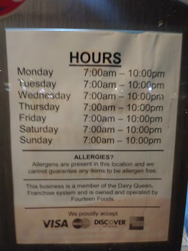 This place needs better management! We wont eat at this Dairy Queen, we usually go to Columbus or Westport to eat at Dairy Queen. This one is usually dirty, floors are always sticky, tables are rarely cleaned, food all over the floor. Food is okay, just a dirty restaurant!