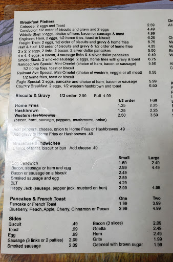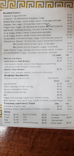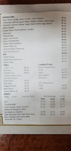 Pretty good food. A bit on the pricey side (usually over $20 for two adults and an 8-year-old) but everybody leaves full. Usually just breakfast and lunch, only open for dinner a couple nights a week. Serving basic "home cooking" fare: eggs, biscuits & gravy, burgers, fries...all cooked to order.