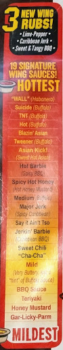 I wanted to give it three stars, way too much bbq on the wings I ordered. However, there are many flavours to choose from and Im sure Id be happier if I tried them. I did order one of my wings to be their hottest "wall" wing. It definitely was something Ill never forget. All in all, decent atmosphere, and decent service. I waited maybe 5 minutes for my waitress initially, but I sat at the bar, and it was busy.
