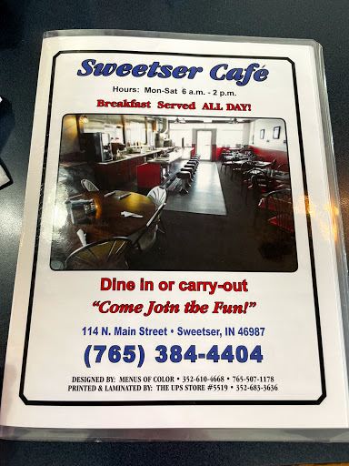 Came to visit for a week or so and made a couple treks to the local cafe and found it to have good food, surprisingly modern POS equipment, modest pricing. Id love to give it 5 stars, but in my mind for a "cafe" to get 5 stars it would need a more diverse coffee menu with some italian espresso, some speciality coffees, in that respect it was pretty much coffee, half n half and your choice of sweet n low or sugar, and if Id have to guess the beans were probably not ground the same day the coffee was brewed. In this regard if it was called "sweetser diner" Id say they hit a home run, but IMO a cafe should have a complete separate coffee menu and wifi available for guests. I know Im asking for a lot for small town indiana, and if I could give them 4.9 stars I would, so suffice it to say I love the folks there, but there is room for improvement and growth, so look forward to visiting again on my next trip.