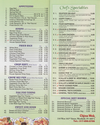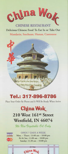 We live in Zionsville, and we have our favorite Chinese restaurant there. However, China Wok in Westfield is probably the best tasting Chinese food weve had anywhere in Indy. The food is always hot, and flavored and cooked perfectly. Its mostly a carry-out restaurant, although they do have about 8 tables to sit at. It doesnt have the ambiance of a larger fancy Chinese restaurant, but the food is really really great. Its in the same plaza as Krogers grocery store at 161st and Spring Mill.