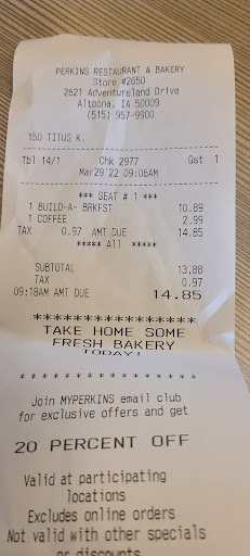 Service was very poor. Toom 10 mins to get drinks. Wasnt even sure who our server was since the greeter got our drinks and took our order. Someone else brought our food out and another person gave us our ticket. Never was checked on once. Waited 20 min just to get boxes. When they brought our food they brought our ticket. To me that just shows they had no intention to come back to the table to check on us. I have eaten at a lot of Perkins but this is far more the worst I have ever been to. Talking to a manager wont do anything so if I were the owner I would look at your servers and get rid of the ones who are bringing dk wn the place. I wont return and I suggest people not to eat here.