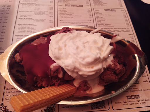 The atmosphere was nostolgic with old signs of things of yesteryear. But the food was overrated. I ordered the 1/4 chicken and ribs with sides of baked beans and mac n cheese. Lets just say the tastiest item was the crossbreed bun with the texture of part cornbread and dinner roll. Problem is it didnt include butter or honey. The chicken was pink didnt seem real juicy or anything like broasted chicken would, the skin was not crisp but more on the slimy side, so I only ate the meat. The ribs were not fall of the bone, and tasted like they were sitting right on the burnt hickory. I burped up the nasty hickory/burned/fireworks taste well into the next day. The mac n cheese consisted of elbow macaroni and canned cheese sauce, nothing homemade about it. This place is fake BBQ!!! The chocolate malt was good,, but only got the one glass no extras, sundaes looked appetizing as well. Little candy store is cute. Avoid if your looking for real BBQ.