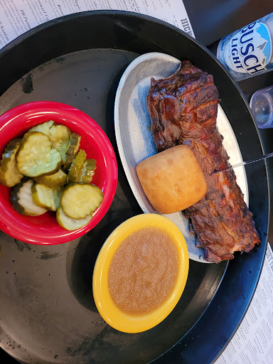 Would I go here again? - Maybe Do I recommend it? - Hmm, maybe. (Keep in mind I smoke my own meats and make my own sauce. Im no chef or expert, but do enjoy excellent Bar-b-que, even if its only "ok") Heres why "maybe".. I arrived at 5 minutes to 9pm and ordered take out. If a restaurant is open and seating me and serving me, Im assuming they will be giving just as good of food as I might have at 6pm, 3pm, noon or whenever they open. Which, I understand, can be difficult for a place that serves real "bar-b-que". My food, which was quite tasty, and had a perfect "smoke" flavor, was dried out, overcooked and tough. I had the Chicken/Ribs Dinner. Quarter chicken (half?) and 4 meaty chunks between rib bones. The sauce was "ok". I dont know if they had any other. It is a vinegar type which seems to have ketchup as its base. Nothing to write home about. Not sweet at all. Which is fine for a vinegar sauce. However, the sides were delicious. perfect mashed potatoes with a brown gravy, buttered corn (the recommendation of the front cashier girl) and a scone. Ohhhh.. that scone. yumm... The corn and potatoes were good, but not too difficult to make and you can get good sides like that most anywhere. But the scone. Ok, I *thought* was going to be cornbread, the usual "grain" type side. when I opened it, it looked just like a dinner roll. But after biting into it, I realized it had been lightly (VERY lightly!) fried, it was light and airy inside, just like Id expect from a dinner roll but a little sweet, with a crispness all over that you just dont get from baking. Of course, I could be completely wrong about it. This is just what it seemed like to me. Personally, I would go back just to order 2-3 dozen of the scones/rolls if I was having a party, or just to put my pulled pork on. It was that good. And very unexpected. So.. IF I went earlier in the day, perhaps the meat would be cooked perfectly, or at least well and not tough and over-cooked. And if I went inside, I *might* find they have different sauces than the only one that came with my meal. So, yeah, if Im ever back in this area I *might* stop in and see if the $10 box meal was as great a bargain as I thought it would be. Or.. confirm that someone needs to learn not to over-cook. In the end, I just couldnt finish either the ribs or the chicken. Just.. too tough.
