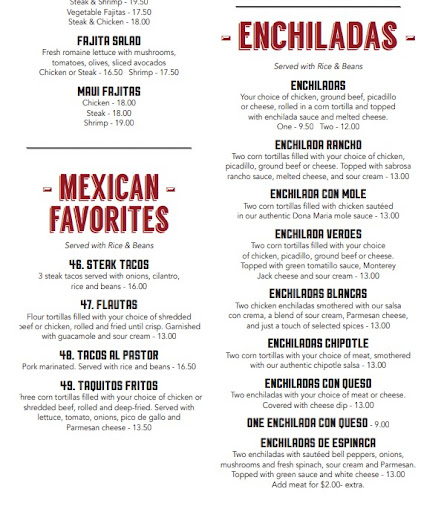 12:30 Saturday ordered from the lunch menu. Selected a beef burrito for $7.50. When I got the bill it was $10.00. Apparently the menu prices only reflect weekdays. Weekend lunches are priced at dinner prices. $10.00 for one burrito is way too expensive. This was runny, bland and filled primarily with rice.