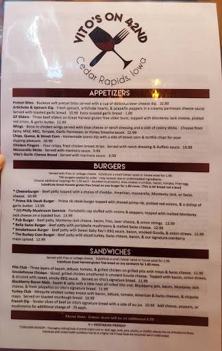 I love Vitos! They have wonderful Salads and Sandwiches. Love the BBQ Ranch Chicken Salad, and the Chicken Pita Sandwhich (not sure what the name is exactly). Their French Fries are crinkle / thick and seasoned. And my husband would totally recommend the calzone. I think the atmosphere is just right for a casual lunch or dinner. Plus, theres a full bar and wonderful appetizers if youre just hanging out, killing time. I love the Spinach Artichoke Dip - Wow, that stuff is good! I dont care what the other reviews say, this place is awesome. We go there regularly, and the staff is always really nice. Yes, they stay busy, but never neglect you! Strongly recommend this place!