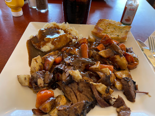 Our service was okay our food was okay. But they would not honor a corporate coupon. The coupon was for kids eat free on Tuesdays. We had two adults meals and three kids meals. According to the coupon we should have paid for two adult meals and got to child meals free they didnt offer a senior discount they didnt offer a free piece of pie they were very stiff from the management point of view . Our ticket was for $66 and the childs milk was $2.50 a piece we left a $10 tip the pies that we ordered had very poor presentation. I ordered a strawberry cheesecake. It only had two pieces of strawberry and very little cheesecake and it was smashed.