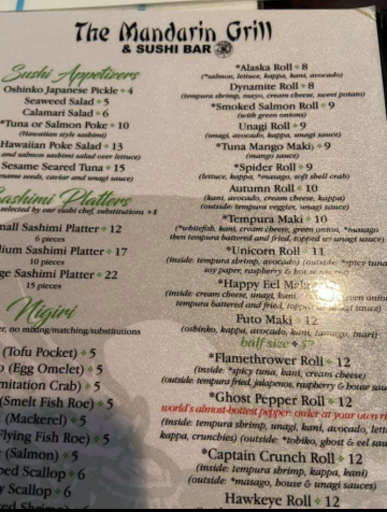 Ive been to mandarin before and the sushi is always good and so are their regular chineese dishes. The service is not always up to par though. I recently e-mailed them asking if they had any weekly specials and the manager (or owner?) Jessica responded with "No we dont do cheapo sales on our sushi, we leave that up to the local super markets" I thought this was kind of a condescending response. A simple no would have sufficed. I responded telling her I would take my "cheapo" business elsewhere. I find it hard to believe that a business with so much competition in the near are would be so rude to its customers, after reading the other reviews on google I see it is very common there. I would reccommend checking out Samurai instead if youre in the mood for sushi. Theyre fairly close and have specials on sushi and hibachi almost every day! Plus the staff is always super courteous.