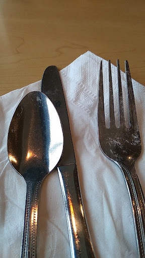 Wait staff was friendly, however silverware was spotted, dinner plate was badly chipped, ham was very salty, and rest of meal was average at best.