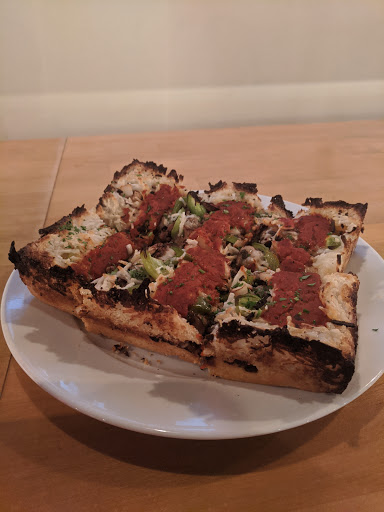 I had a fine experience at this restaurant, but it wasnt anything remarkable. It has a fast-food feel. It felt like a place youd take children to, but the menu didnt seem particularly child-friendly. The pizzas arent traditional. I tried a small Mona Lisa, which comes with olives, tomatoes, mushrooms, and ricotta cheese. That, with a sparkling water, cost $15 ($18 after tip). I took half of it home, so I guess I got two meals out of it, but it still seemed pricey for one person eating at such a casual place. It tasted fine, but it wasnt what Id seek out on a night I want a pizza.