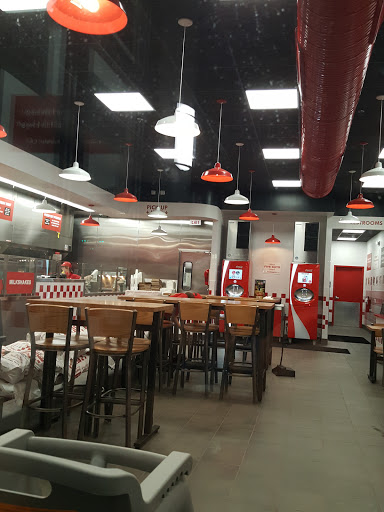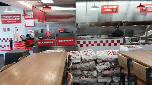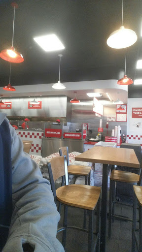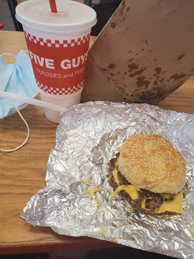 This is NOT the 5 guys that Im used to. It was good, but not for the price. Fry oil isnt as good as it used to be, which reflects how their fries taste. The burgers are way too expensive, and the menus should note if there are two patties or one. The atmosphere in there is crowded too, and with nothing to look at or do. Just barely ok. I could tell that everyone in there was thinking the same thing I was...its sad because I really wanted to have this be my new fav place. Oh well, what can ya do?..