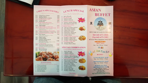 Living in Oskaloosa you dont have a lot of choices for fine dining - the Pepper Tree comes to mind but theres not much else Id rave about in town although the Mexican Restaurant Mi Ranchito also offers excellent value. Thats why I have been consistently surprised and happy about Asian Buffet. There is always someone available to greet you at the entry way and typically we are seated within moments of arriving. There are always about 2-3 dozen things to eat at this buffet and except for the occasional slow spot the dishes are always refreshed in the buffet. The variety is excellent - there are always chicken, beef, pork, shrimp and seafood dishes available. There is always fried rice, white rice and chow mein. There are always 2 hot soups and, I guess this being the midwest, there is always pizza and fried chicken wings! There are always desserts like jello, seasonal fruit, cake, 4 flavors of ice cream and cream puffs. The dishes themselves range from excellent chicken with broccoli in a brown (oyster?) sauce to plain baked salmon and a variety of shrimp dishes: coconut, boiled shrimp (plain in shell) which is my favorite and improbably a variety of sushi rolls of which I always partake. Everyone here is friendly and attentive. If you need a dish taken away or a refill on your drink someone always seems to notice and get the job done. Although its a buffet I always leave a tip because service is part of the package that is offered in this nice local place.