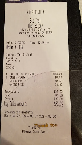 We live in Ames and the two Thai places there are lack-luster. Consequentially, Eat Thai Thai Eatery (ETTE) is our jam. We used to look for excuses to head to the west side of the Des Moines metro to go to Cool Basil, but that place has been going down hill for the last couple of years. ETTE has been consistently excellent and is our new favorite Thai restaurant. Add to that my pregnant wifes love of and constant cravings for spicy vegetarian food, weve been making near-weekly trips to ETTE. Pricing is good, service is excellent, and the place is always clean. Id give it six stars if I could.