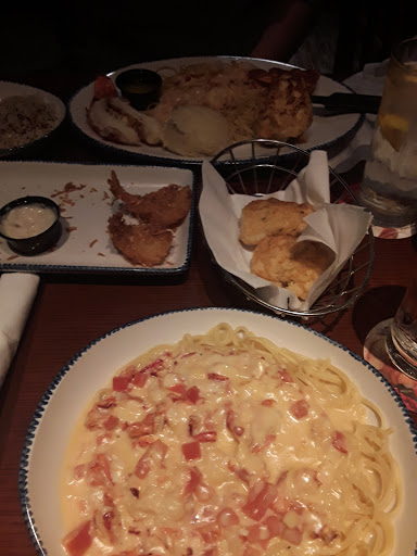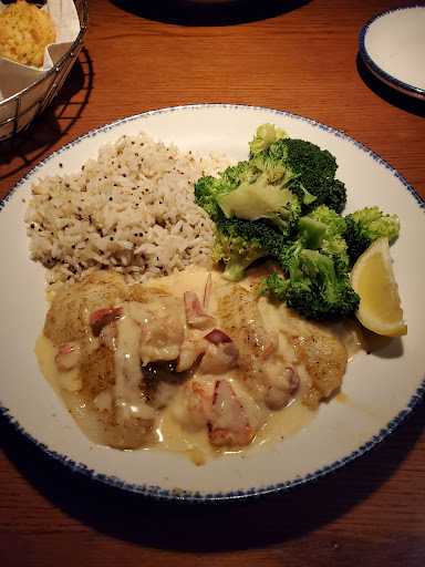 I hadnt been to Red Lobster in years, but my mom had a gift card and I love seafood. I have to say we were both quite disappointed with the food (and drinks). We decided to share the the lobster, salmon and shrimp, which looked like a huge plate of food on the menu, and got an additional soup (lobster bisque)/salad lunch order. I was quite disappointed in the lobster bisque. It basically was a beer cheese soup with a few scraps of lobster. Not like any other lobster bisques Ive had, which are a buttery cream sauce. When we got the entree of the lobster, salmon and shrimp, I almost told our waitress it wasnt what we ordered. It was half the size as the picture made it seem and we literally didnt see the the lobster, but discovered it was so tiny that it was covered by all the rice. The salmon was also half the size as pictured and was a overcooked and too greasy for my taste. My mother also had a cocktail, which was way too sweet for her to even finish. This wouldnt have been a bad meal except for the price. I could have paid the same amount of money or less for a better quality fish or seafood at a higher end restaurant. My advice, go to Bonefish Grill or Waterfront instead.