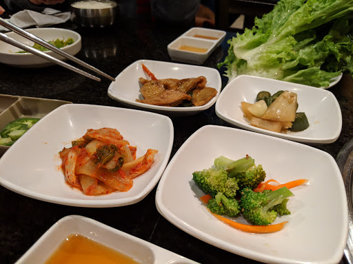 I was in the area with a friend who had been saying for days how much she wanted Korean food so we made a stop here on Sunday around 2pm. As of now, there only seems to be three Korean restaurants of note and all of them in the Shawnee Mission/Overland Park area. We wanted to try Sobahn, but theyre not opened on Sundays and I just envision Mrs. Kim from Gilmore Girls saying - NO. Go away. So we tried Chosun instead. Only Chosun and Choga seem to have actual grill tables. From what I can tell Sobahn cooks all the food in the back, which for me takes some of the fun out of Korean BBQ. Although, if youre doing lunch and dont want your clothes to smell of pork and beef that might be a decent option. When we arrived there were only 4 other tables seated. There are about 4-5 six seaters along the wall when you enter and another 8 four seater grill tables along the far wall. There are also booths and tables without grills. When you enter theres no host stand so you kind of just have to wait until someone sees you to be acknowledged and seated which on a busy night could be awkward. We decided to order the Combo 4 with bulgogi, beef brisket, pork belly and pork shoulder. The bulgogi and shoulder were marinated, the brisket and belly were not. It came with romaine lettuce, garlic, a gojujuang sauce and jalapenos. A basic but tasty lettuce salad started it off and when the meat arrived so did the banchan. I have to say the banchan was a little disapointing. There were only 5 options. When I do Korean BBQ in LA or Chicago theres at least 8 or more different dishes. This is Kansas City, but still a bit of kale, 3 small broccoli florets, daikon kimchi, cabbage kimichi and some kind of hot dog kimchi dont really cut it. Where are the pickles? Wheres the tofu? A missed opportunity I think. The meat, however, was a good quality and the grills worked really well, giving a nice char to all the meat. I had to turn it up though as they only set it to 1 of 3 "flames" when they lit it. There were two sauces, a very salty sesame one and another one I couldnt remember tasting of anything really. Service was interesting. Our waitress was new and let us know that. Not a problem, she was attentive and tried, but whenever she came by to check on us she would clear something from the table. Not a bad thing, except when she would reach across us while we were eating to pick up a straw wrapper or empty dish. A bit intrusive but better attentive than dismissive, I guess. A decent experience overall. Im excited to try Choga to compare the two.