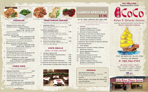 Every Chinese place I eat at I order the same thing: Generals Chicken. I judge each place by that dish alone and go from there and with CoCo I was very dissappointed. The chicken chunks were too large with not enough coating on them. They were not even crispy either leaving me to feel like I was just eating a grill chicken platter with a sauce to it which was not even spicy due to the grill chicken watering it all down. Service was fine but one thing I did not like was our straws were the bendy type ones and were not wrapped leaving me to guess who or what touched my straw before I used it to drink. Not trying to slam this place but when comparing it other Chinese places in Topeka it has a lot of growing up it needs to do.