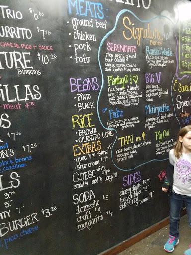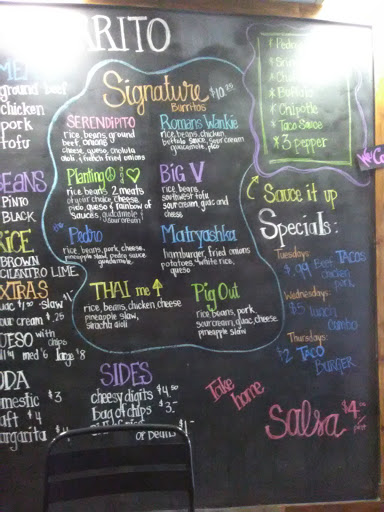 Its a shame. All of the preconditions are there for this to be a great burrito place, but it just doesnt rise to that level. Their featured burritos are pretty expensive for what they are, and you cant make any additions/substitutions, which is quite annoying. That said its decent and their salsas are good!