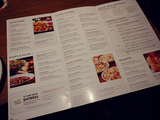 The food has been fantastic at times and so-so at other times. I have eaten at the Olive Garden about four times. The inconsistency of the food is a problem. The breadsticks are ALWAYS too salty. The dishes are not consistent. I often order the same dishes, the quality has ranged from iffy to excellent with every visit. I am not sure what is going on in the kitchen, but this is the first time I have crossed a well known chain like the Olive Garden off my list of favorites. Consistency is a MUST!