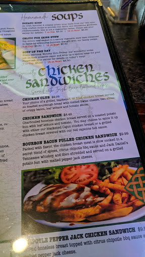 My friend and I lunched at the Celtic Fox yesterday. It was enjoyable - a friendly atmosphere and the Reuben, although not very sightly when served, and the potato soup I had were very tasty. It was a little steep on the prices considering the quality of food, but I would go back because the setup inside and the general atmosphere was nice, with a raised seating area for eating, a stage in the corner, the bar, and then another room with a pool table.