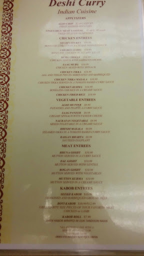 I have had the lunch special at Deshi Curry twice in the past month, and have found the food quite delectable and satisfying. Several entres are offered with a choice of 2 sides and chapatis and and a fried delicacy, all for $5.99. I also ordered a hot chai each time, the best Ive tasted outside of India. Not sure why some gave bad reviews, but they deserve a much better rating right now. Please try them out, and you will be in for a treat.