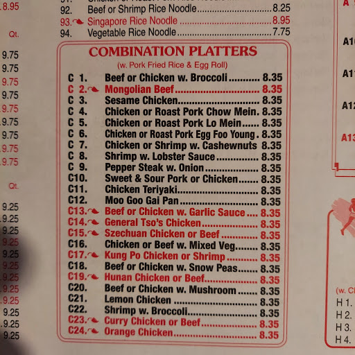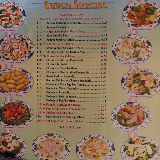 FOOD IS DELICIOUS! I LIKE THEIR: SINGAPORE RICE NOODLES, SWEET AND SOUR CHICKEN, GENERAL TSOS CHICKEN, AND ABSOLUTELY LOVE THEIR CRAB RAGOONS(:If you are new to trying this restaurant, and are skeptical I would recommend eating during their lunch special 11:00-3:30p.m. You get A LOT of food for $5.75: Your entree you order + pork fried rice or white rice+ 2 crab ragoons + medium soft drink!