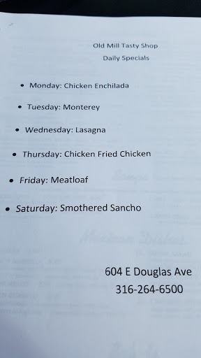 Its time-travel back to the 1800s, where you can enjoy a light & airy diner like something from the time of gaslights and early soda fountains and milkshakes. You GOT to try this legendary place. --------- The Old Mill is basically a sandwich shop, but with REAL sandwiches (the kind youd expect in a real sandwich RESTAURANT, that SPECIALIZES in great sandwiches. Also has usual cafe menu items, soups, salads, etc., and I think some more solid food, too. --------- Fabulously relaxing place, in spite of being right downtown, on the citys busiest street, near the railroad tracks. --------- Sitting down in there just automatically relaxes you. Its hard to explain -- you just gotta EXPERIENCE it. --------- Really nice waitresses and staff (I think its been in the same family for, well, forever), Probably the closest you can get to a home-cooked meal in Wichita. Decent prices for really decent food. The only shortcoming is location -- on the north side of Douglas, just west of the railroad underpass -- so parking is tricky (try St. Francis St., or walk there from anywhere in downtown, as most folks do). --------- Fun place to go with a friend or two. Definitely lets you re-live the "good old days," especially when youre having too many bad ones. Not many restaurants make you happy just sitting in them. This one REALLY does.